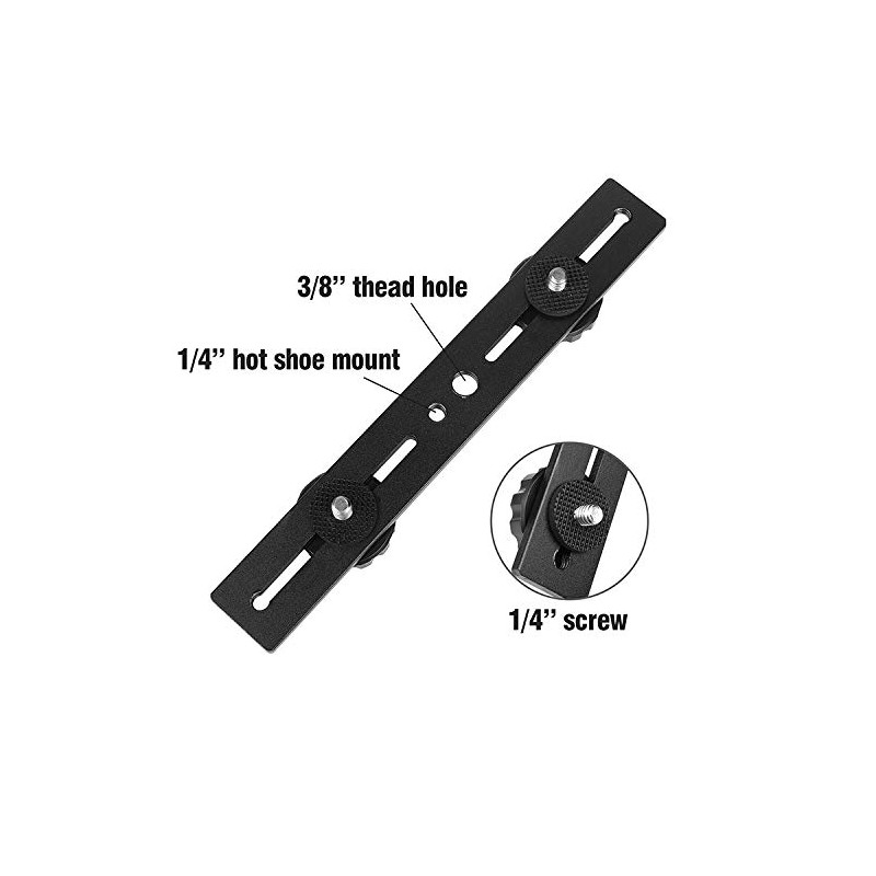 Dual camera mount extension bar 1/4" screws with non-slip rubber pad allow you to mount two rigs at the same time. This dual flash mount bracket comes with 1/4’’ and 3/8’’ thread holes at the center for tripod, light stand, handle grip, quick release plate and other support.
