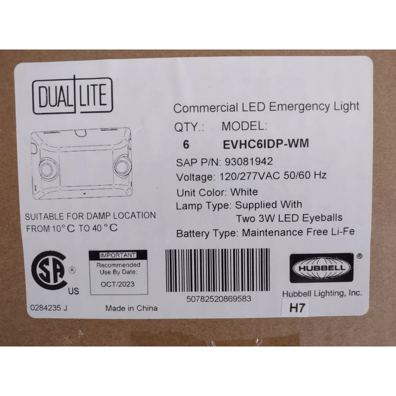 Dual lite LED Emergency Light, EVHC6IDP-WM, 120/277VAC 50/60 Hz, Color: White (For further detailed description, go to Dual lite website and put in model number). For first time installation, back box is needed. Dual lite model: EVHCEZP (SOLD SEPARATELY)