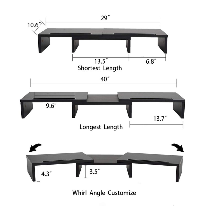 2-Length can be adjusted.You can put one or two monitor as you like.Also your notebook,cup,file can put on it.