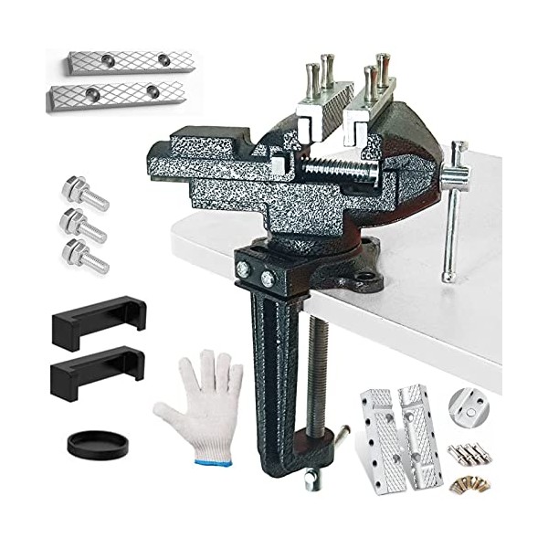 - Powerful and Rich Jaw Configurations: The extra multi-functional jaws add 10 screw holes and 4 clamping posts to help you handle delicate irregularities easily. Two jaw washers are used for protection of the parts of golf clubs, watches, jewelry and other valuables without damage. High quality and strong steel jaws for common use are widely applied to woodworking, metalworking, cutting conduit, drilling, gluing, sanding, planning, sawing and so on.