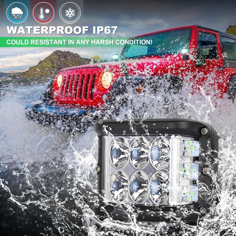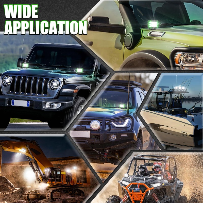 - Exceptional Illumination: Equipped with high-intensity LEDs, these LED pod lights offer a striking 6000K cool white spotlight along with a vivid green side shooter light. With 60W per pair and 4000 lumens per pair, these side shooter LED off road lights excel at illuminating overlooked corners when traversing trails after dusk.