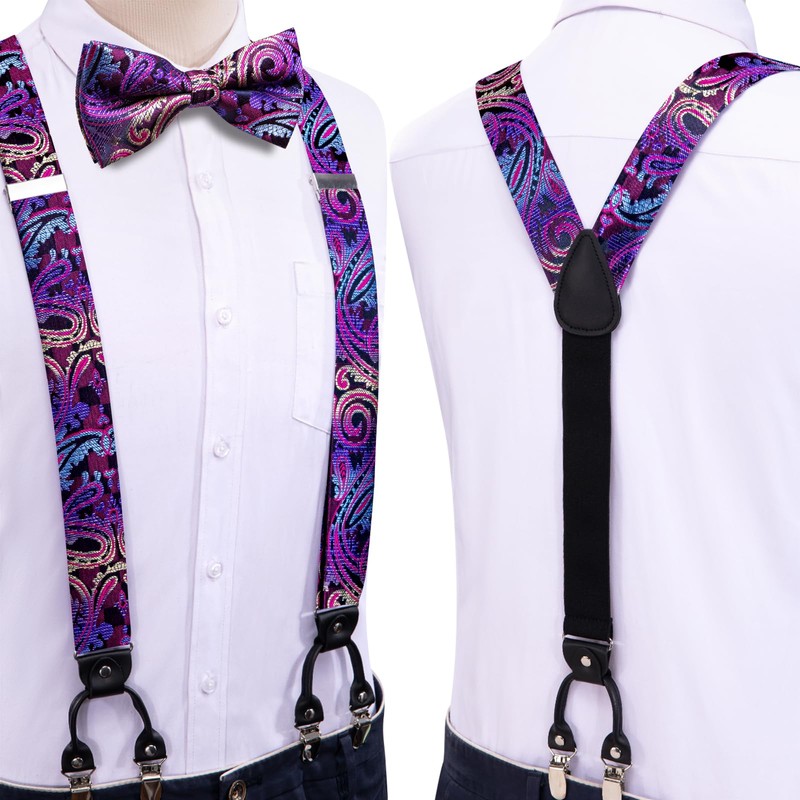 Dubulle Mens Clips Suspenders and Pretied Bowtie Set Y Shape Adjustable Paisley Checks Braces Pocket Square,Blue Purple