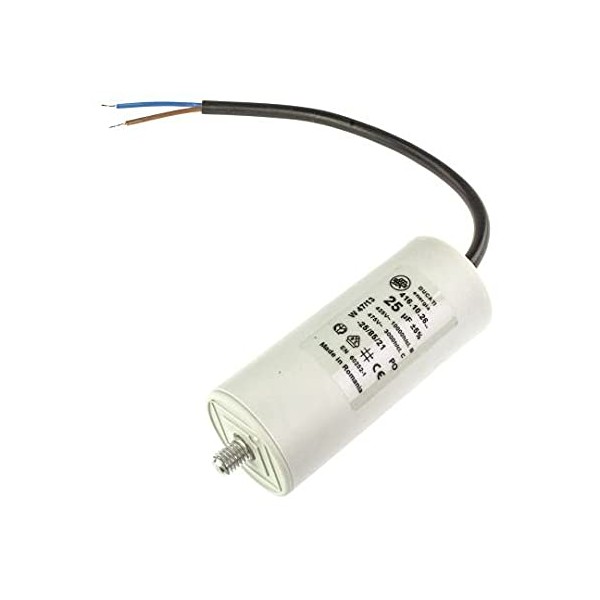 Capacitor, 25uF, 450V AC, Lead Film Capacitors, Motor Run, 1x Quantity - 4.16.10.26.14 Capacitor, 25UF, 450VAC, Lead, Capacity: 25µF, Capacitance Tolerance: ±5%, Capacitor Housing Style: Can, Capacitor Dielectric Type: PP (polypropylenene) (polypropylene Terminals: wired Diameter: 40 mm, Height: 92 mm, Operating temperature max: 85 °C, Operating temperature min. : -25°C, Product Range: 4.16.10, SVHC: No SVHC (07-Jul-2017), Rated Voltage: 450VAC, Body Diameter: 40mm, Capacitance Tolerance ±: ±5%, Capacitor Application: Engine Start/Run Capacitor Assembly. ing: panel, derivation factor: 0.002%, dissipation factor temperature: 20°C, external length/height: 92mm, cable length: 250mm, no. number of pins: 2-pole, operating temperature range: -25°C to +85°C, thread size: M8 x 10, tolerance +: 5%, tolerance -: 5%, rated voltage VAC: 450 V V V