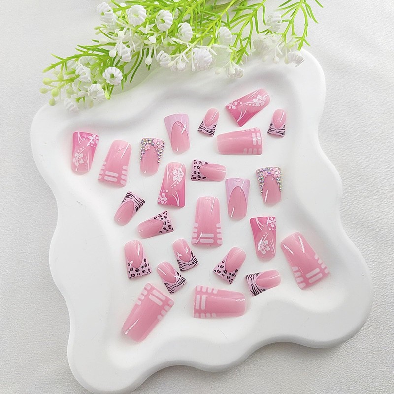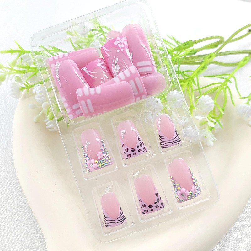 Duckbill Nails Press ons Medium Long Press on Nails Duck Fake Nails French Tip Glue on Nails with Flower Rhinestones Leopard Lines Designs Pink False Nails Glossy Shiny Manicure 24Pcs