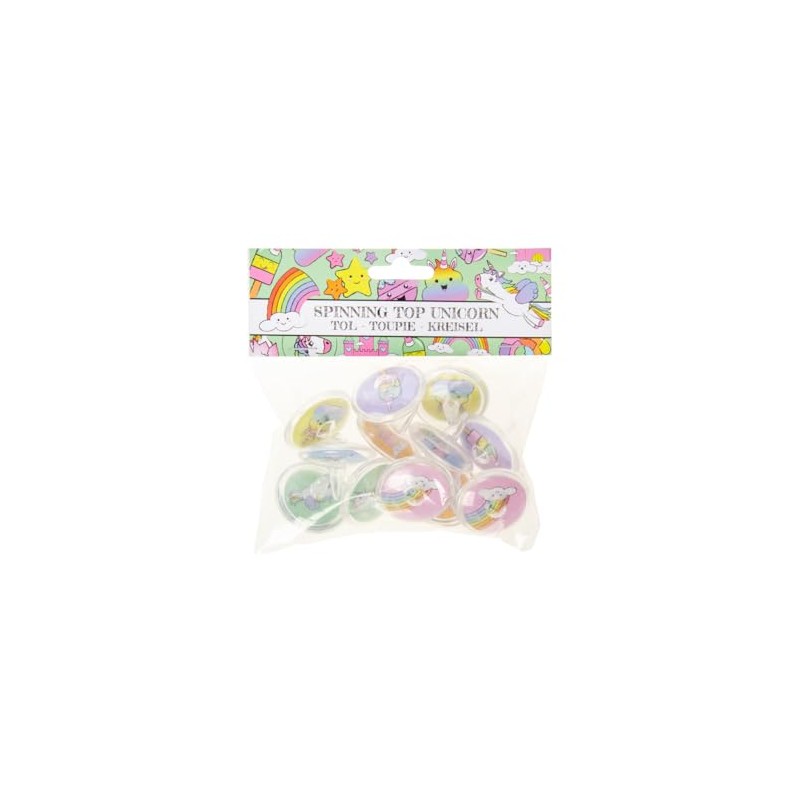 DUCKIEZ 1 pack of 12 Unicorn Spinning Tops. 6 different designs chosen at random. Perfect party bag filler or school fete giveaway!