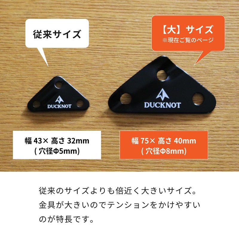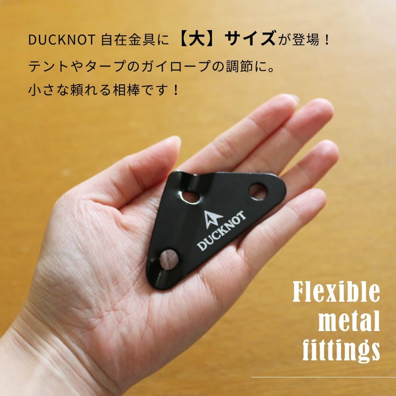 - DUCKNOT universal metal fittings are now available in large sizes. For adjusting guy ropes for tents and tarps. Your little go-to party! Nearly double the size of traditional size. The large hardware makes it easy to apply tension. You will receive a set of 12 triangles with DUCKNOT logo