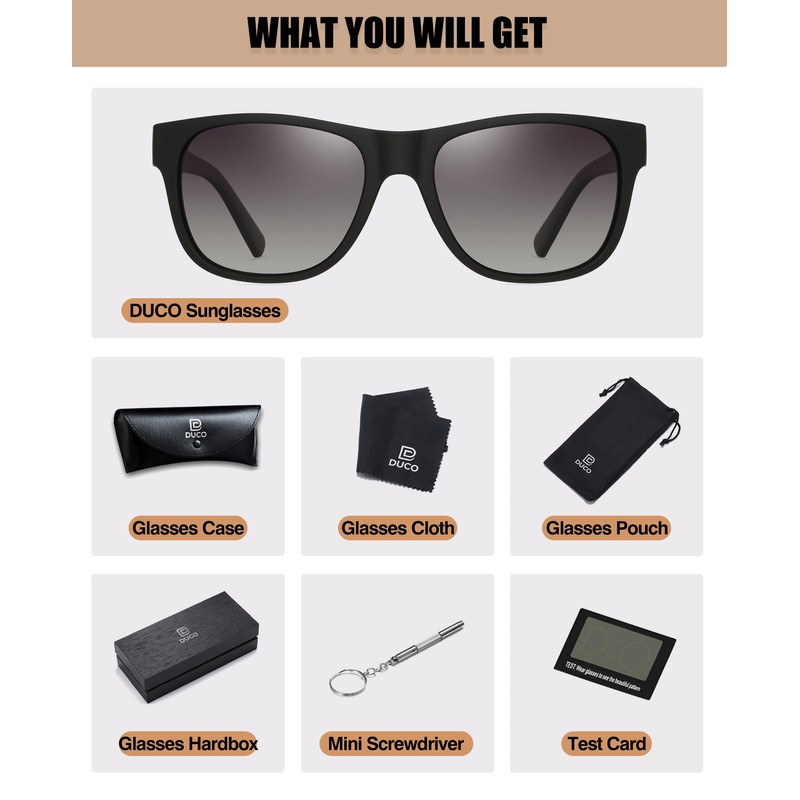 - Complete set and lifetime warranty: bring it whenever you go, as these glasses come with a pouch and an exquisite leather bag that serves as storage for your sunglasses when not in use; any problem on the glasses only please contact us, DUCO offers lifetime warranty