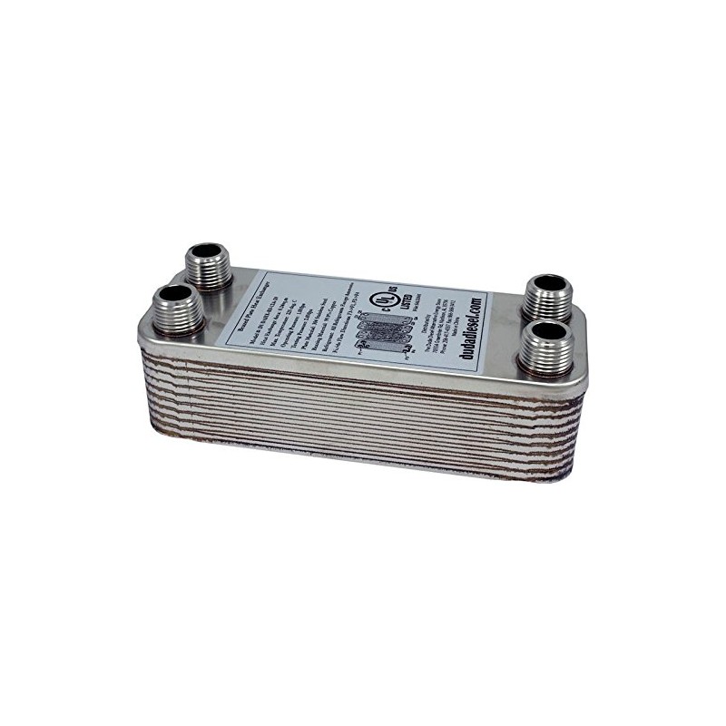 Stainless steel plate heat exchangers . Brazed with 99.9+ percent Pure copper by Duda Energy . Plate heat exchangers have significantly good heat transfer rates because they use metal plates which have high heat conductivity rates and the plates are extremely thin. The plate heat exchangers also achieve high amounts of heat transfer through Convective forces with both working fluids. With large temperature differentials, great amounts of heat transfer can be achieved using a plate heat exchanger.This is an extremely popular unit for wood burning furnaces, radiant floor systems, refrigerant systems, straight vegetable oil conversions, beer chilling, air conditioning system and solar water heating systems. It will work for any application in which the desired result is for two fluids (liquid or gas) to exchange heat. Fluid a passes from the port on the left of the heat exchanger through every other channel created by the plates to the opposite end port on the left of the heat exchanger (looking at it the long way). fluid b passes from the port on the right through the other channels created by the plates and comes out the other port on the right side. The fluids are essentially touching each other through the plates and heat is transferred from the hot fluid to the cold fluid. (But the fluids do not mix).