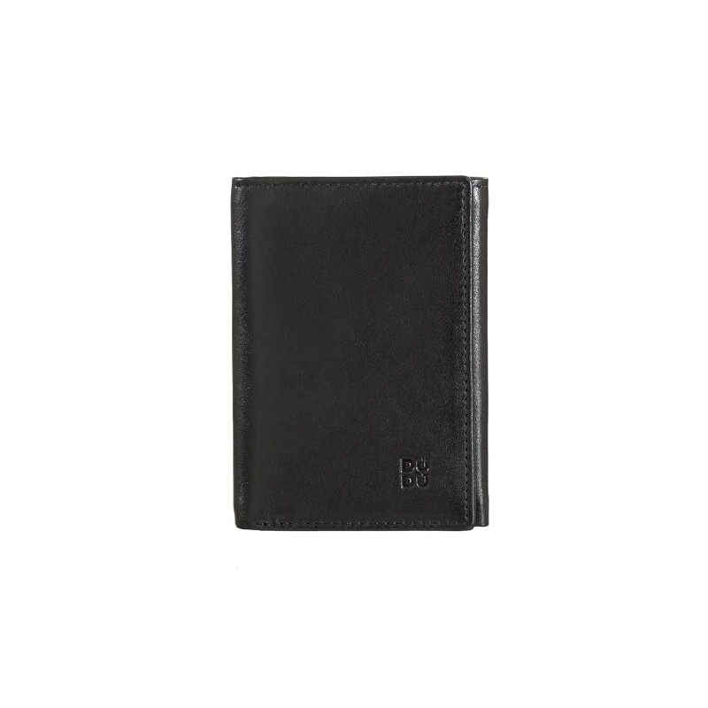 DUDU Men's Leather Trifold Wallet with Inner Window Tri-Fold, Vertical Billfold, Cards Holders, RFID Blocking and Snap Closure, Multicolour Black