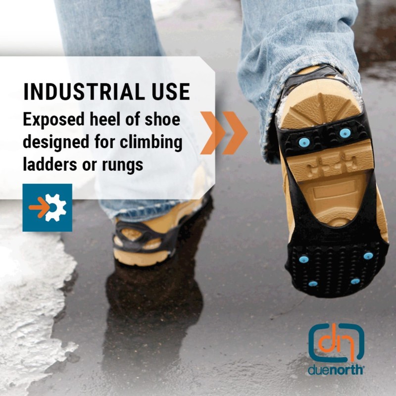 Due North traction aids help give you traction on ice, snow or similar porous surfaces. However, because NO product can completely prevent a slip or fall on slippery surfaces, remember to exercise care when walking or running in Due North traction aids. Caution should also be taken when moving on any hard or polished surface such as granite or marble, on ladders, or when driving a vehicle. Use care, as these traction aids are sharp and may injure or damage flooring, surfaces, or skin. Due North traction aids are not to be used for mountaineering and/or hiking, in rocky terrain, or when the user may encounter steep up or down slopes. Due North traction aids are not designed or intended to be used on high heel footwear. This product contains latex.
