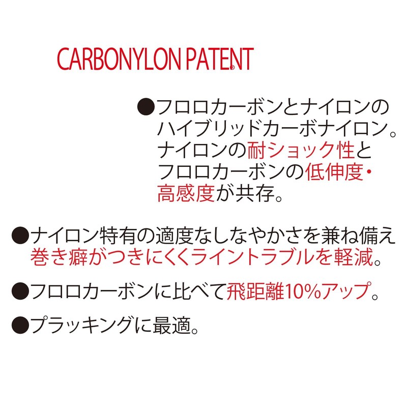 - Carbon Nylon: Fluorocarbon and Nylon Hybrid Carbon Nylon Nylon shock resistance and fluorocarbon low stretch and high sensitivity coexist. Combining the moderately amount of nylon characteristic to reduce line trouble. 10% more distance than fluorocarbon Great for placking