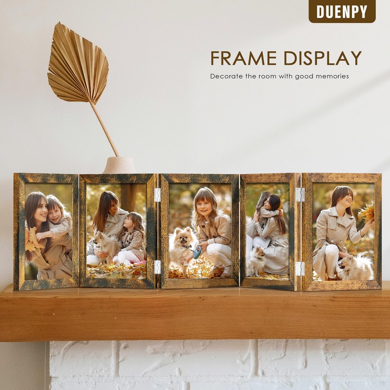 DUENPY 5 Folding 5x7 Picture Frame Horizontal Engineered Wood Accordion Photo Frame with Plexiglass Tabletop Bookshelf Display Brown
