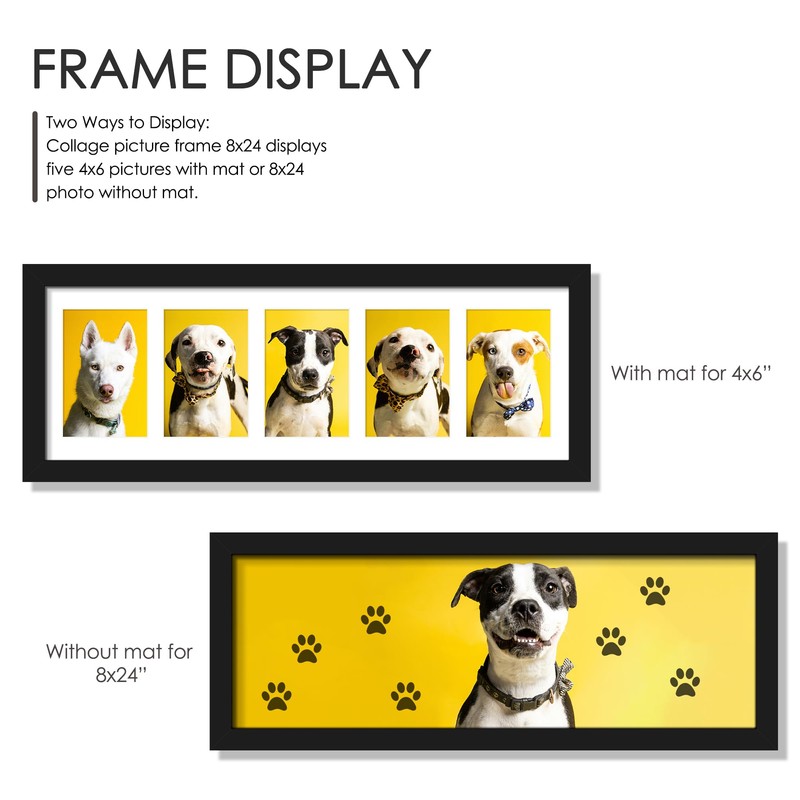 - Multifunctional display: The frame with opening mat is more suitable for a five 4x6 photo display. If you don't use the mat, you can use it as a matless 8x24 photo display.