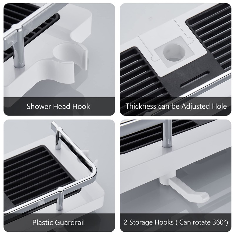 • &Thoughtful Design& The Shower Organiser Holder have aluminum 90 degree curve fence,to avoid the unnecessary scratches and prevent items fall off,also it can be adjusted height according to individual requirements.With a drainage frame at the bottom, no water is accumulated and no odor.