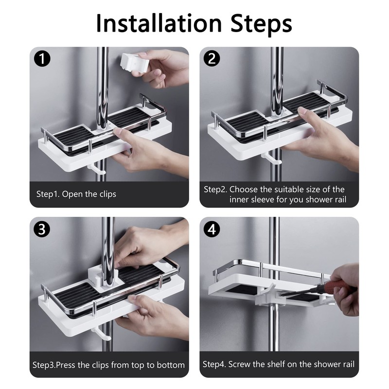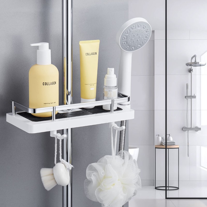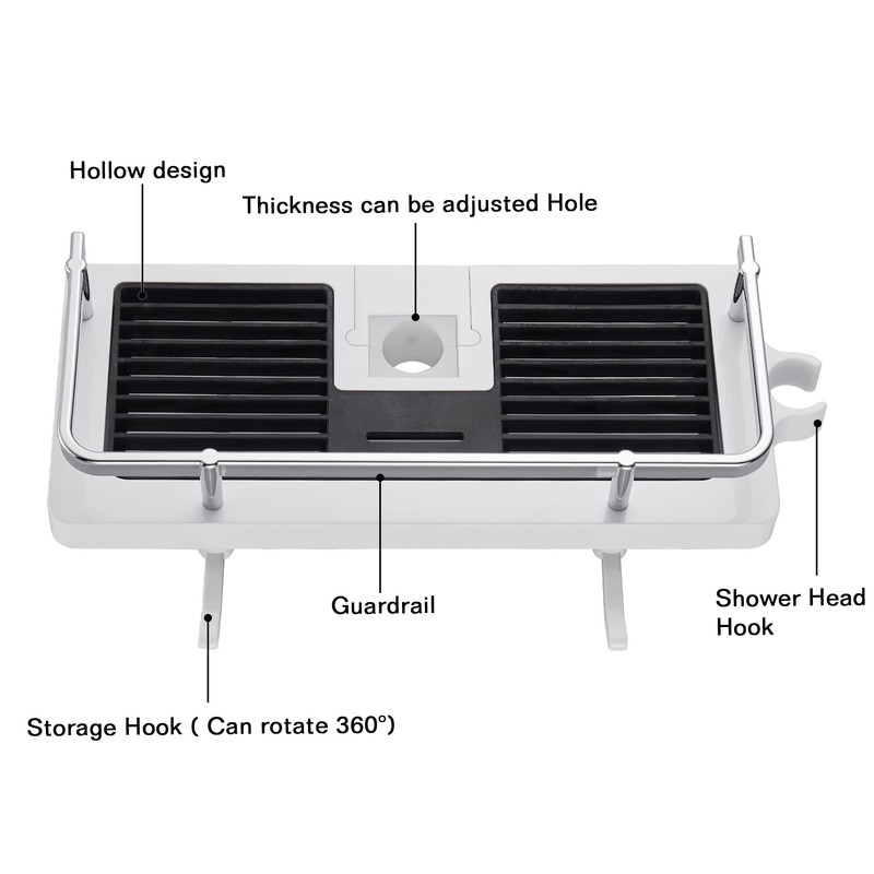 Shower Head Shelf is easy to install on the round shower rod,no drilling,maximising the use of space, made by ABS and metal,rustproof,durable and easy to clean, no scratch and have a good look.