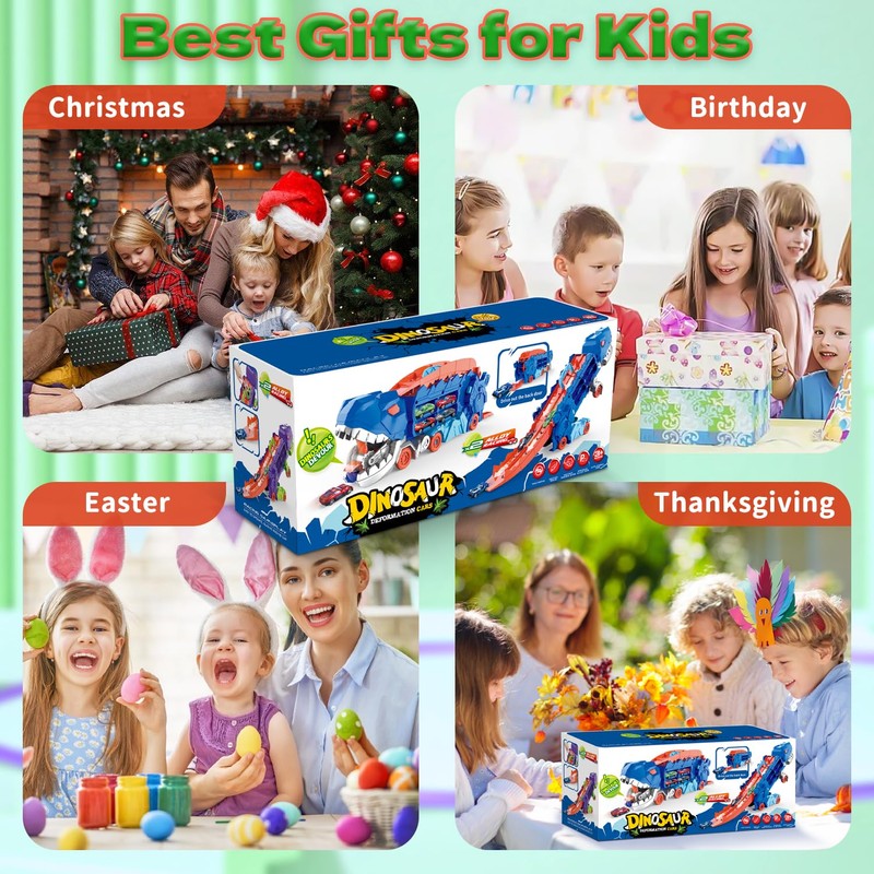 - Perfect Gift for Any Occasion: Delight the dinosaur and car enthusiasts in your life with this versatile toy set. Designed for kids aged 3-8, it’s an ideal gift for birthdays, Christmas, Easter, and other special occasions. This durable and safe truck toy fosters imaginative play, creativity, and hand-eye coordination, making it a thoughtful and engaging present that kids will cherish.