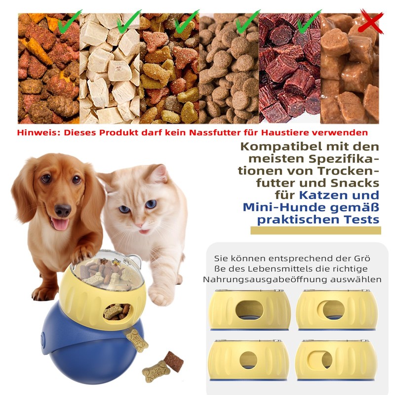 - 🐶【Innovatives Tumbler Design】Durch das Design des unteren Schwerpunkts und die physikalische Struktur zittert oder dreht sich das Futtergerät, wenn das Haustier es berührt, und das Futter tritt langsam durch die kleinen Löcher an der Seite aus. Diese dynamische Interaktion simuliert das ”Jagd“-Verhalten, erfüllt die Natur von Katzen/Hunden und reduziert die Langeweile von Haustieren und aktiver Teilnahme anregt.