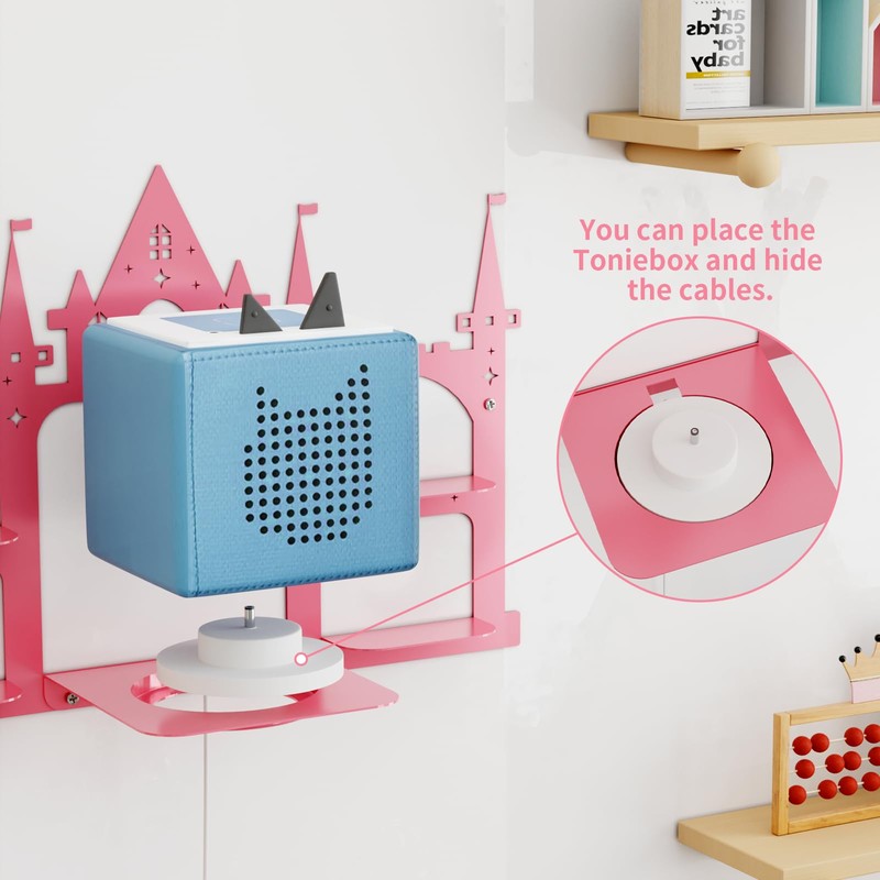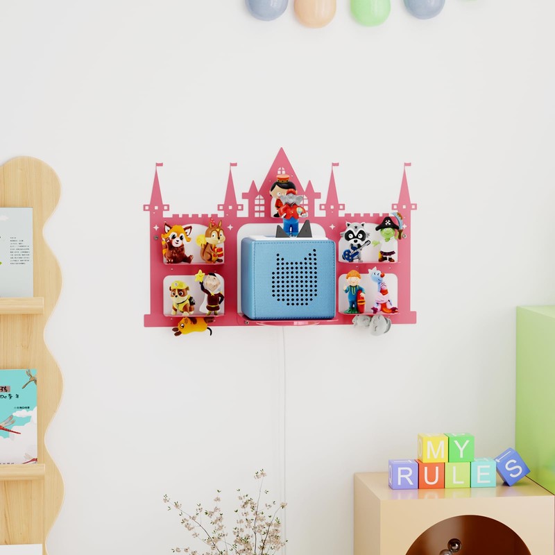 All-in-One Tonies Organizer with Charging & Wall-Mounted Convenience: This tonie box storage shelf combines a toniebox charger dock, tonie box display, and shelf for figures in one wall-mounted unit. The tonie wall storage securely holds figures via embedded magnets, while the central cubby stores charging cables and toniebox headphones. Its slim castle floating shelves profile saves floor space, making it ideal for small kids rooms. Durable metal construction ensures stability, and the neutral design suits any kids room decor style.