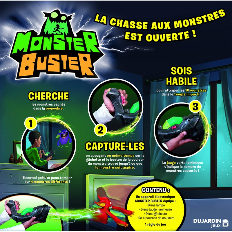 - A Monster Buster* device equipped with a lamp, a light meter, a trigger, 4 colour buttons. Includes 1 game rule book English language not guaranteed).