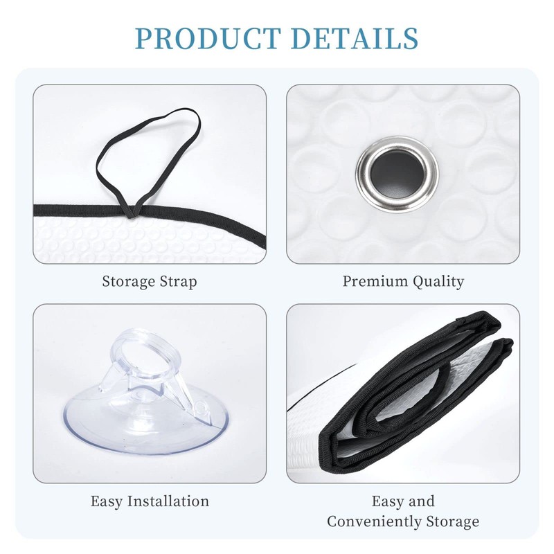 - EASY TO USE AND STORE : Package comes with 1 sun shade + 4 scution cups. There is 2 metal holes above sun shield. You can use two suction cups to hold sunshade in place, the other two are spare. Foldable sunshade with straps at side, easy and quick to storage or reuse.