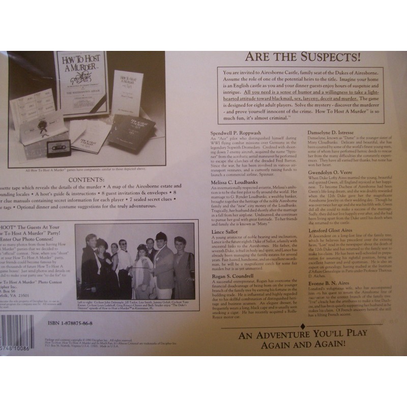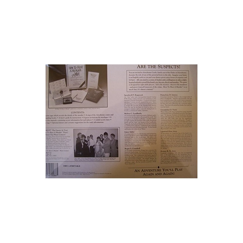 You are invited to Airesborne Castle, family seat of the Dukes of Airsborne. Assume the role of one of the potential heirs to the title. Image your home is an English castle as you and your dinner guests enjoy hours of suspense and intrigue. All you need is a sense of humor and a willingness to take a light hearted attitude toward blackmail, sex, larceny, deceit and murder. The game is designed for eight adult players. Solve the mystery--discover the murderer--and prove yourself innocent of the crime.