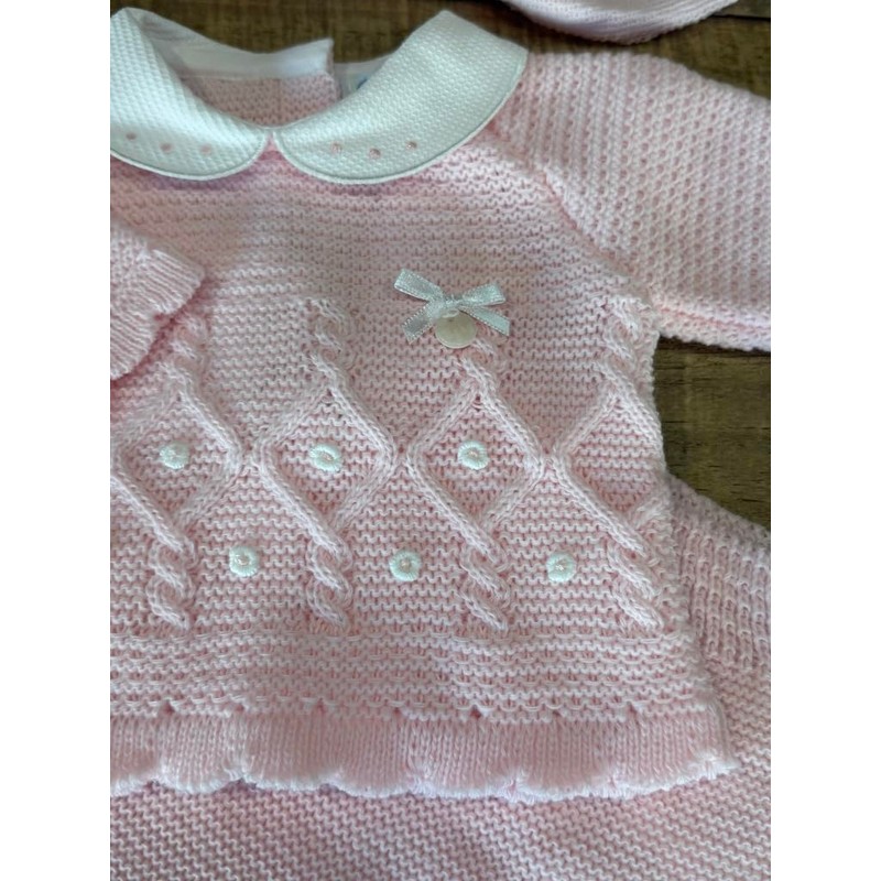 Dulce de Fresa Baby Girl 3-piece Knitted Sweater, Footed Pants, and Hat Set - Made in Spain (Pink, 1M)