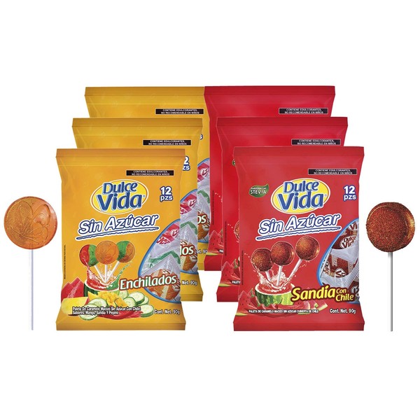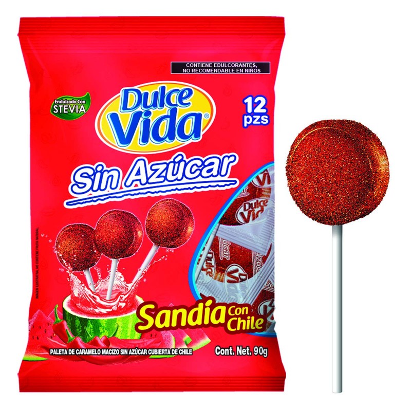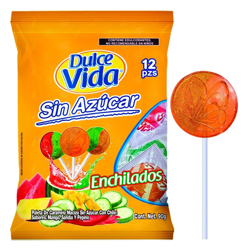 Paletas de Caramelo Macizo con Chile. SIN AZÚCAR. Sabores Sandía cubierta de Chile, Mango Enchilado, Sandía Enchilada y Pepino Echilado.