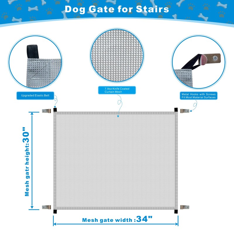 - Upgrated Material and Sewing: Made of high quality density and elastic nylon fiber glass fabric mesh, this dog gate for stairs can greatly withstand the scratching of pets. Specially designed 7.9oz mesh allows you to keep your pet in sight