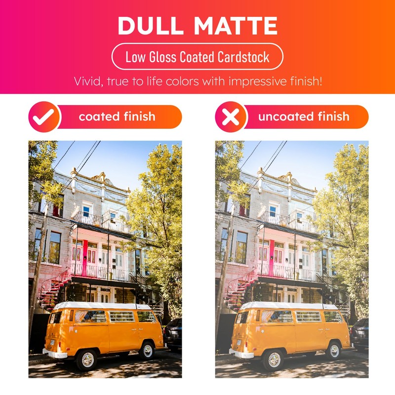 - DULL COATED FINISH - Has a slightly more vibrant coated finish than the matte stock and prints with brighter colors. Ensures detailed, crisp and vivid photos and prints.