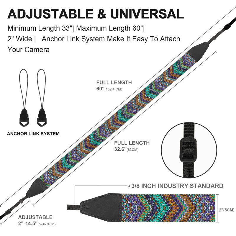 • ✔︎【UNIVERSAL】Compatible with most Nikon, Canon, Panasonic, Sony, Olympus, Pentax and other DSLR, SLR, mirrorless, rangefinder cameras and film camera. Camera strap connectors of 3/8 of an inch in width is the industry standard for DSLR cameras. Our camera straps are designed with two attachment methods to be compatible with all cameras, it’s quick and easy to attach or detach your camera with the 2 additional Anchor Link system.