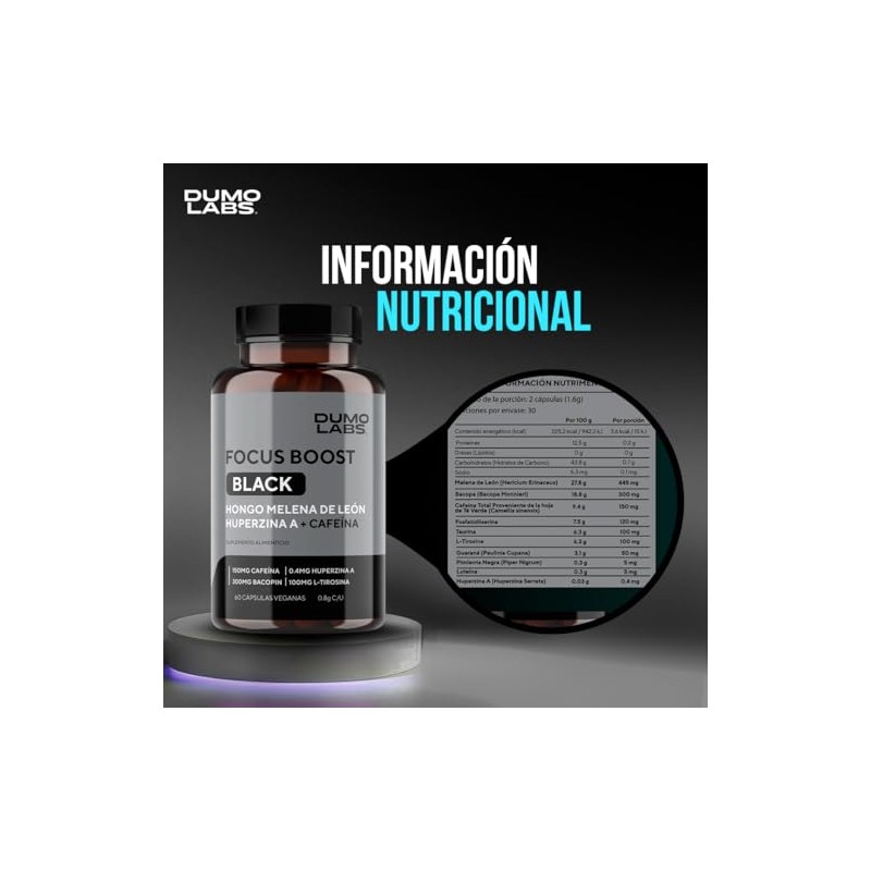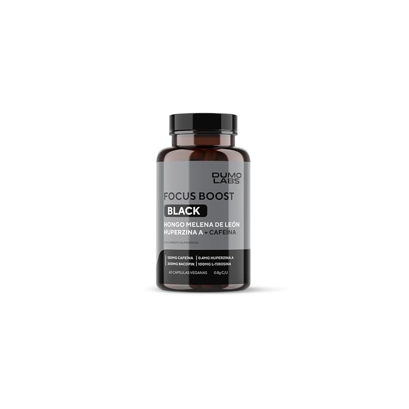 Dumo Focus Boost Black Nootrpico Natural con Melena de Len, Bacopa, Cafena y Huperzina A Energa Mental, Enfoque y Rendimiento Diario 60 Cpsulas...