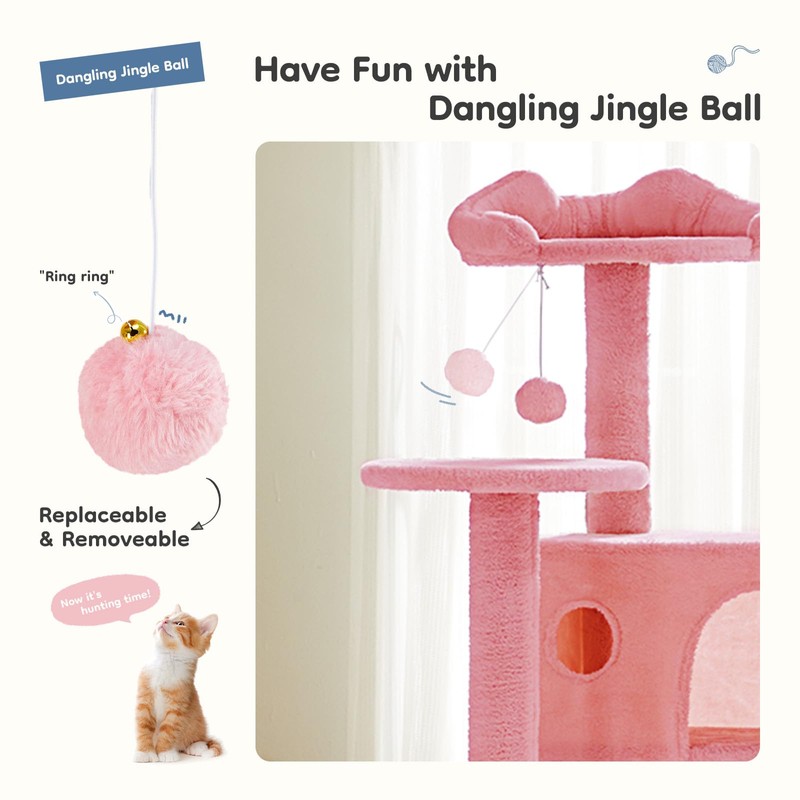 DUMOS 54-inch Indoor Cat Tree Tower –Multi-Level Pet House for Large Cats with 2 Condos, Scratching Posts, Round Platform, Small Ladder, and Toys, Pink