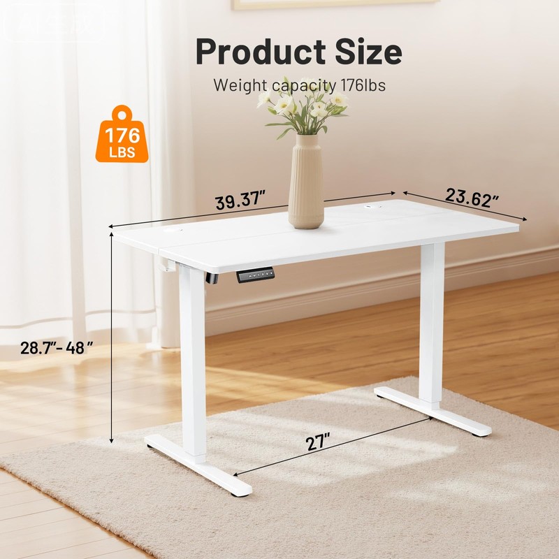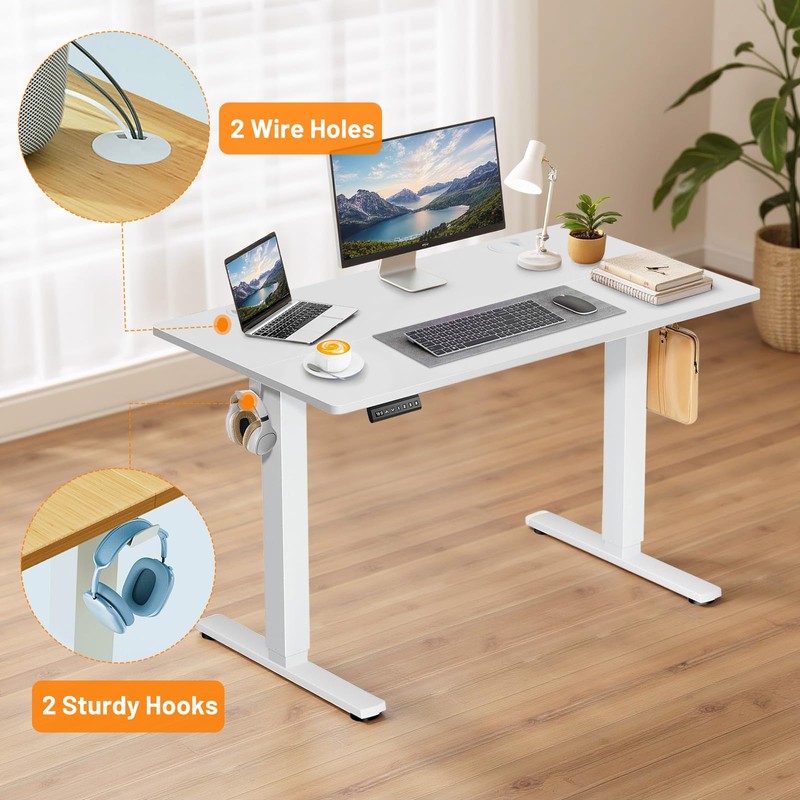 DUMOS Electric Standing Desk 39.4 x 23.6 Inch, Height Adjustable Sit Stand Desk with LED Display, Memory Presets, Hooks & Cable Holes, Ergonomic Workstation for Home Office, White