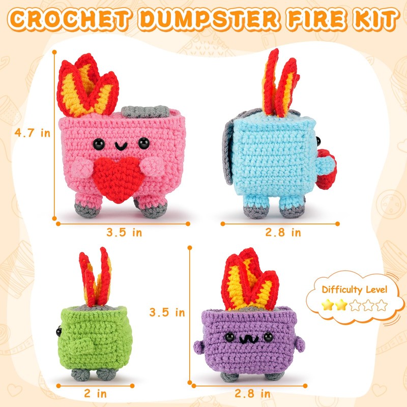 - Dumpster Fire Crochet Kit -- We hope that through this cartoon image of a burning trash can crochet to convey to everyone to protect the environment and fire safety awareness, we are very much in need of raising the awareness of everyone to protect the environment, this is a creative crochet set, have a try!