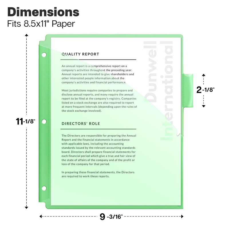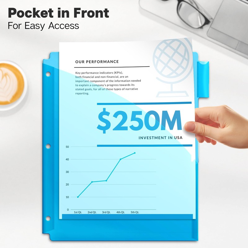 3-hole punched for standard binders, binder divider tabs with pockets include slash pockets to hold loose papers, flyers, assignments, homework or business presentations. 1/5-cut tabs make them perfect tab dividers with pockets for 3 ring binders.