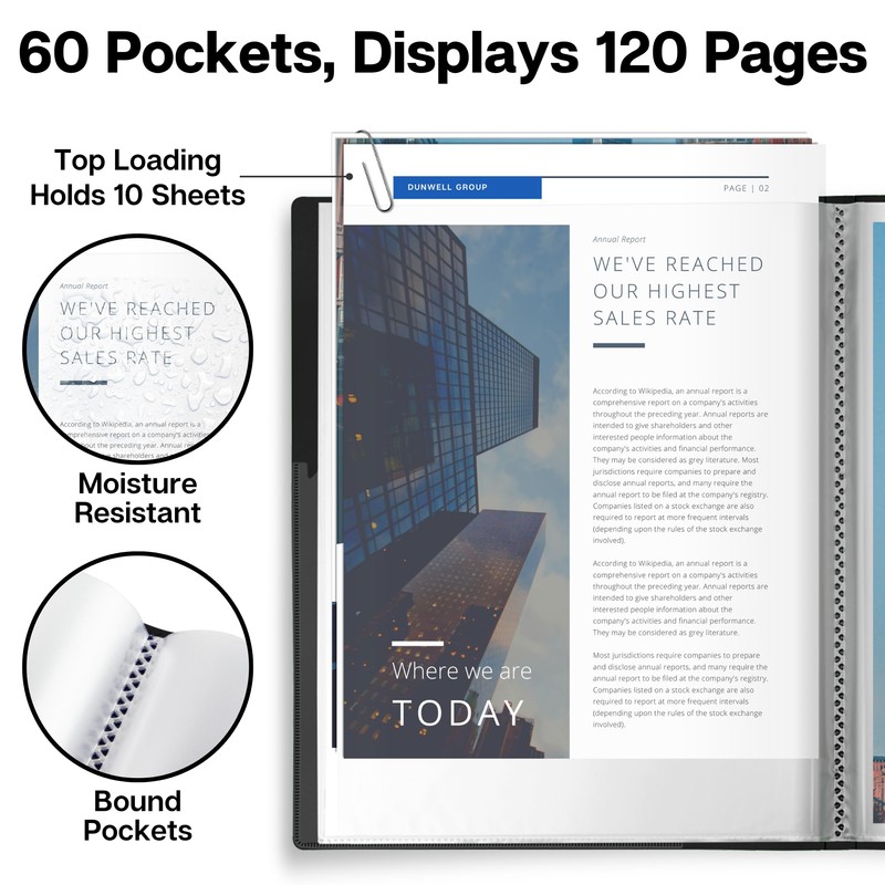 Dunwell Presentation Binder 60-Pocket, Displays 120 Pages, 8.5x11 Portfolio Binder with Plastic Sleeves, Storage and Organizer for Documents, Photos, Kids Artwork, Projects, Recipes (Black)