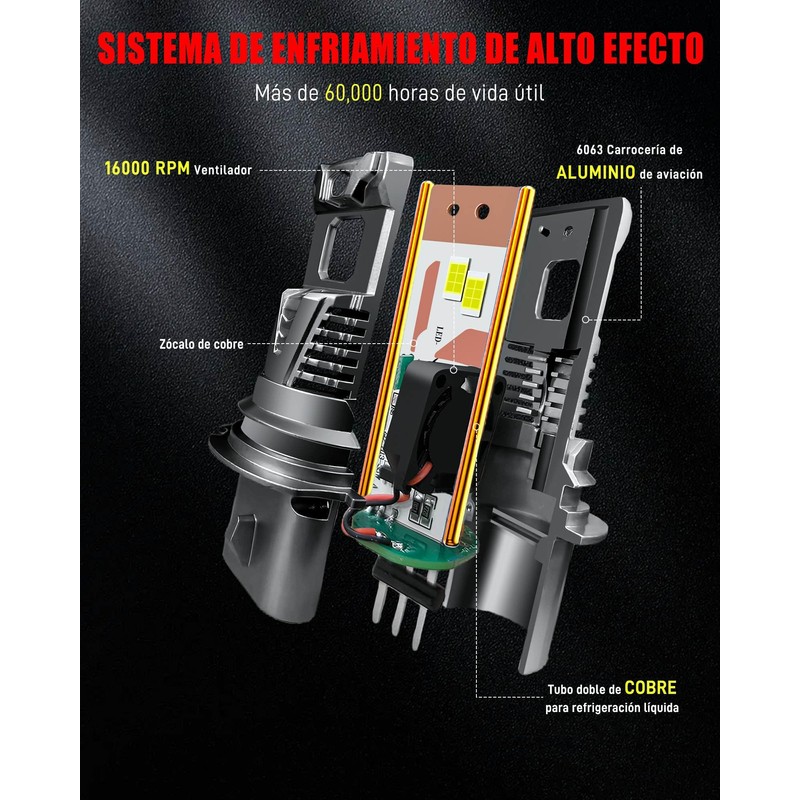 - 【60000 horas de vida útil】el cuerpo de las bombillas de los faros 9004 LED está hecho de aluminio de aviación 6063 y 2 tubos de cobre para disipación de calor, fuerte y resistente, la parte inferior de la bombilla está diseñada con un ventilador turbo silencioso de 16000 RPM con disipador de calor para mantener las bombillas frías, vida útil muy extendida, de hasta 60000 horas.