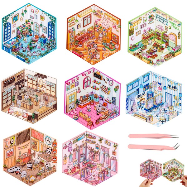 DUOHERESHUI 3D Miniature House Stickers, 8-Piece DIY 3D House Sticker Set, Creative, Stacking Scenes, from Home Construction, Cafe, Bakeries, with Tweezers, for Scrapbooking, Diary, for Adults and