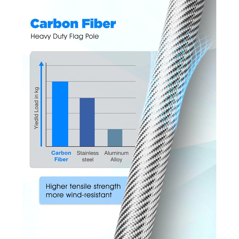 - 【High-Strength Carbon Fiber Flag Pole】Made from aerospace-grade carbon fiber that's 5x stronger than steel but only about a quarter of its weight. Higher tensile strength resists bending, snapping, or warping — even in high winds.