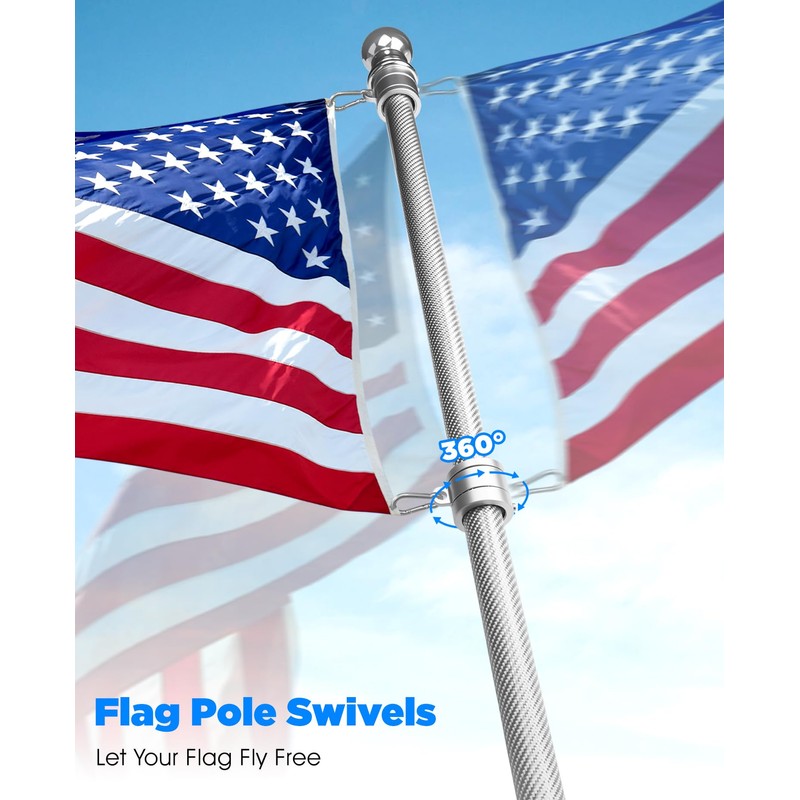 - 【360° Rotating Flag Pole Rings】Includes 2 premium aluminum flag rings with ball bearings to let your flag spin with the breeze — no more twisted or wrapped flag poles.