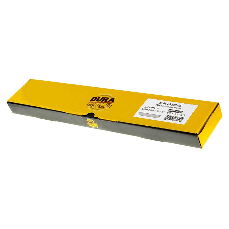 - Box of 20 Dura-Gold Premium 320 Grit Gold Pre-Cut PSA Longboard Sandpaper Sheets that are 2-3/4" Wide x 16-1/2" Long. High-performance longboard sandpaper sheets with a PSA pressure-sensitive adhesive backing and an easy-to-peel-off backing liner to protect the adhesive backing.