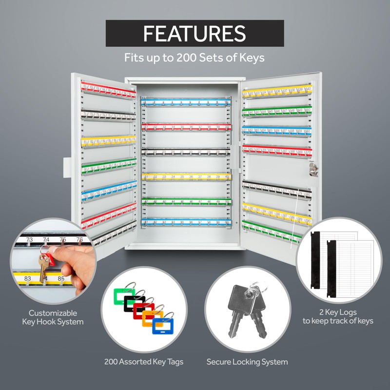 - INCLUDES - 2 keys for the exterior lock, a key log sheet, 200 blank colored key tags, adjustable numbered key hooks, and pre-drilled holes with mounting hardware.