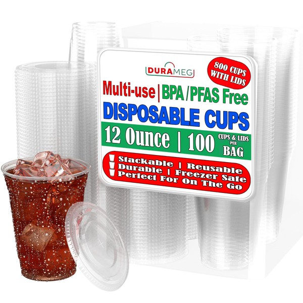 - 🧋 【8 X 100 PACK PLASTIC CUPS & LIDS】 - 12 oz plastic cups and Straw-Slot Flat Lids - Our premium plastic disposable cups 16 oz are translucent so you can clearly see the beautiful colors of different drinks and enjoy the sight of fizzy crystal bubbles.