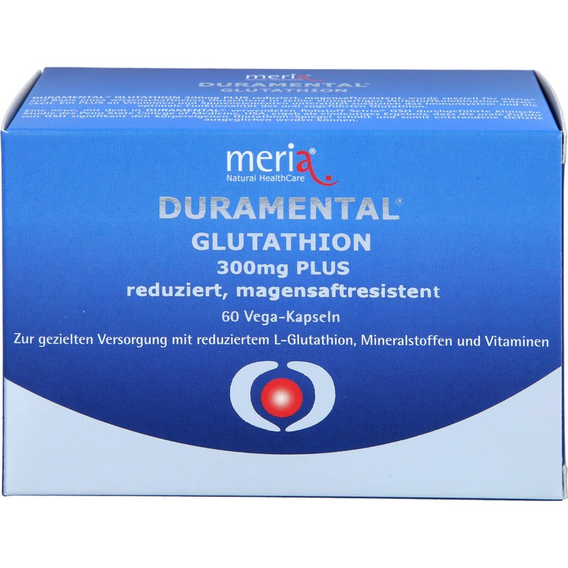 Duramental Glutathione 300 mg Plus enteric resistant capsule(s) (pack size: 60 pieces) reduced, highly concentrated glutathione in gastric juice-resistant dosage form has been specially developed for meria® based on a scientific report in its unique combination of active ingredients. For the optimal bioavailability of orally supplied glutathione, sufficient concentrations of the trace elements selenium and zinc are necessary, they activate the required enzymes.
