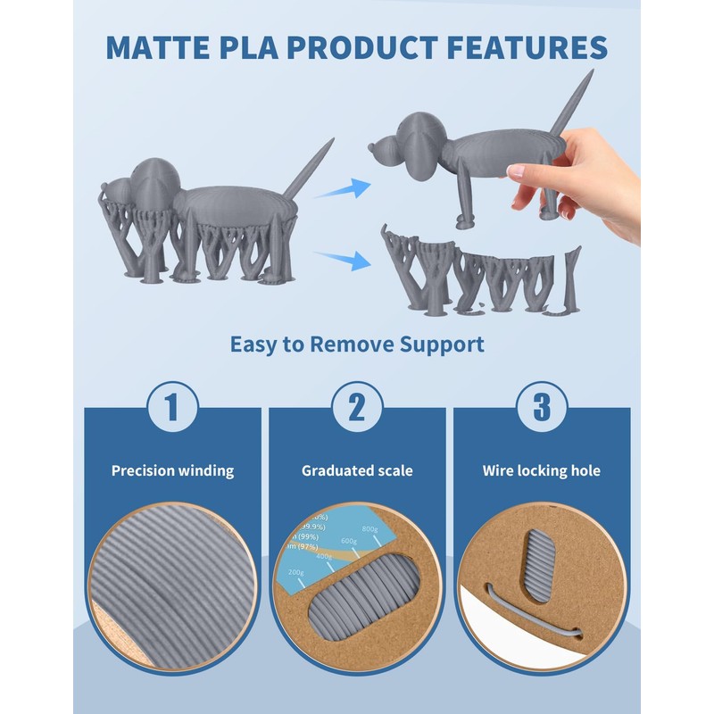 - 【Matte Finish】The new series of PLA filaments are designed with matte finish, if you need a model not that glossy, this matte PLA series are your top choice.