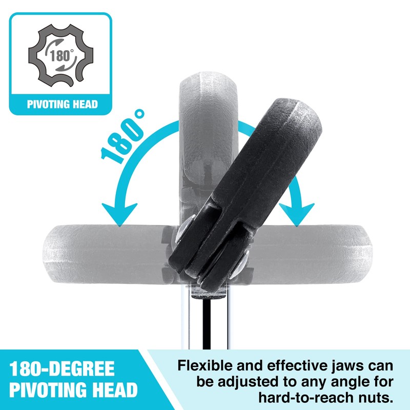 • The 180 pivoting head holds its position at any angle to access hard-to-reach nuts. It features a spring-loaded jaw that securely grips and easily removes stuck-on faucet nuts.