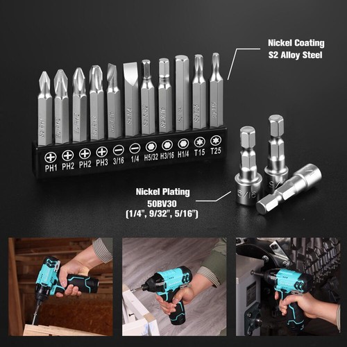 - 👍 Package Included: 12V cordless impact driver, 11pcs screwdriver bits with organizer(PH1, PH2, PH2, PH3, 3/16", 1/4", H5/32", H3/16", H1/4", T15, T25), 3pcs nut driver bits(1/4", 9/32", 5/16"), tool bag, 2.0Ah lithium-ion battery with fast charger