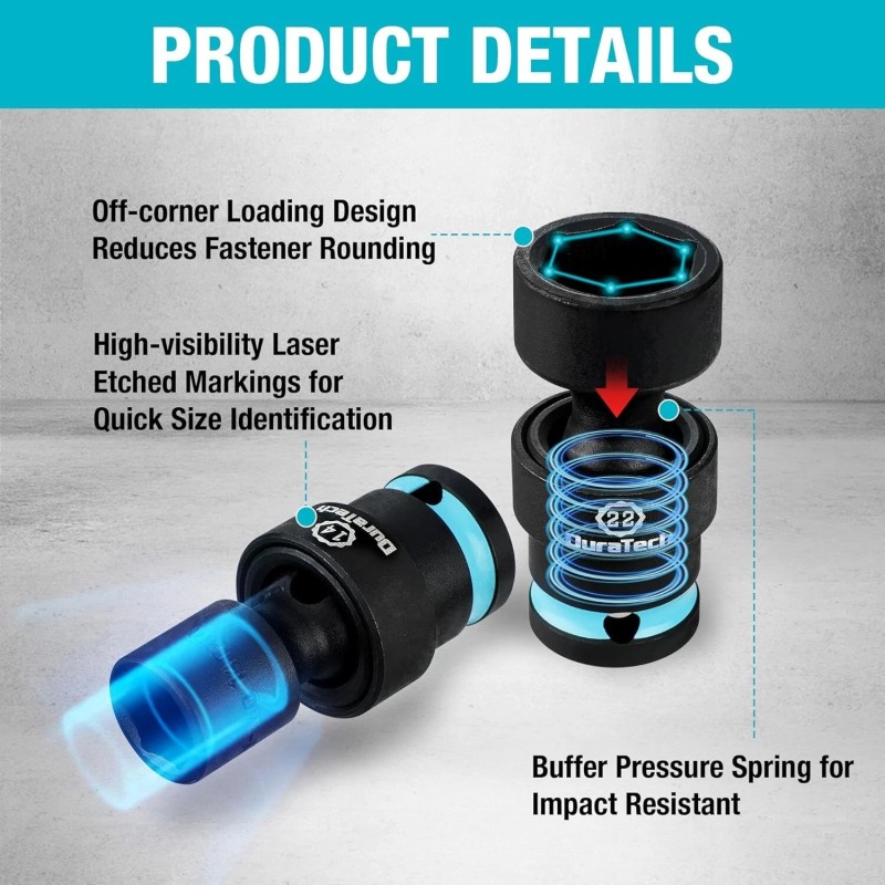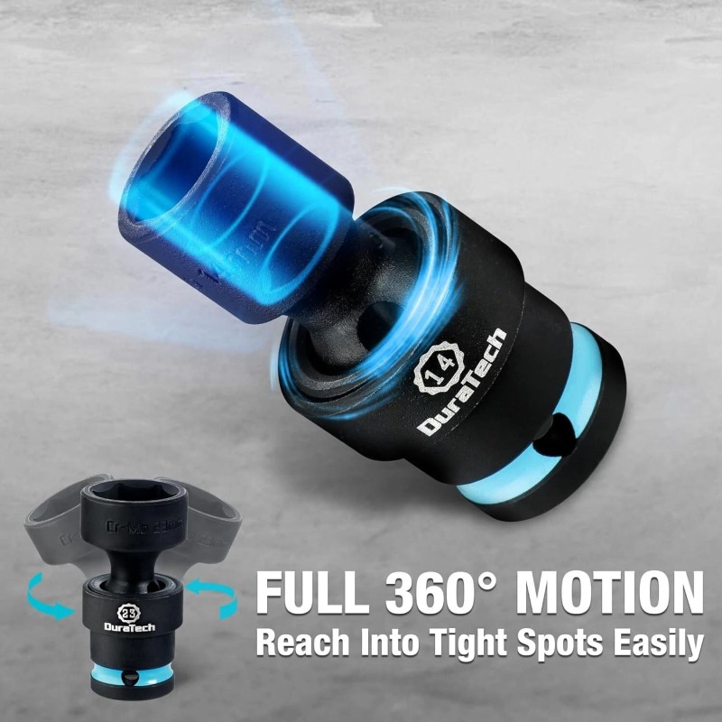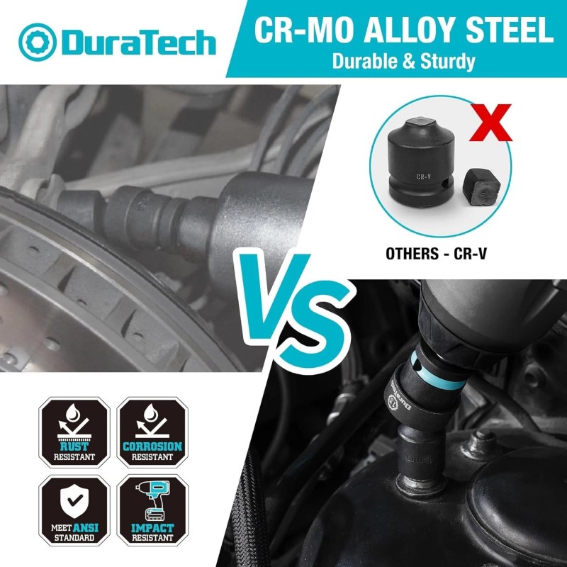 Durable and Sturdy: DURATECH swivel socket set is manufactured from premium impact-grade chrome molybdenum steel which can withstand extreme torque variations in fasteners and provide excellent resistance to corrosion and high temperatures