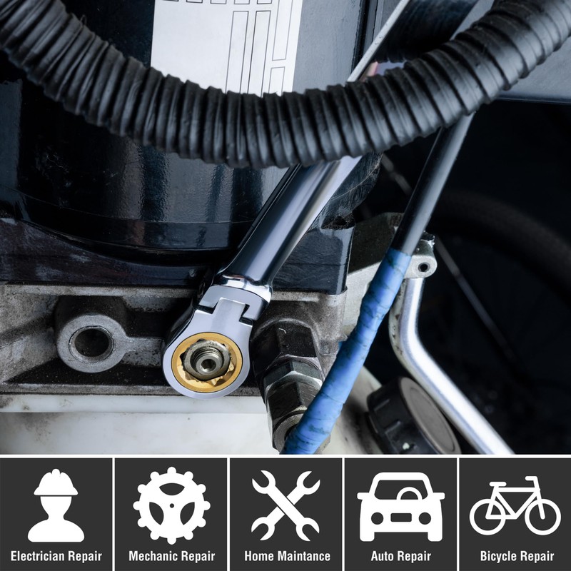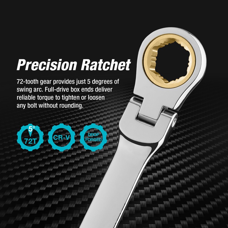 - 72-tooth ratchet gear needs a minimum of 5 degree swing arcs that is perfect for restricted, hard to reach work spaces 180 degree rotating flexible heads allow you to apply leverage at any desired angle and get around obstructions great for tight spaces design