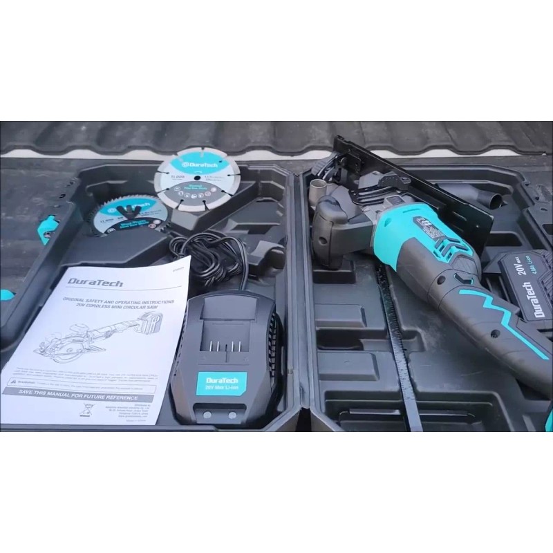 - 【WHAT YOU GET】1 * 20V cordless mini circular saw; 1 * battery pack (compatible with DURATECH 20V series lithium battery products); 1 * battery charger; 1 * 24T alloy mini saw blade designed for wood; 1 * 60T mini saw blade designed for wood and plastic; 1 * 9T diamond mini saw blade designed for tiles; 1 * hex key; 1 * black parallel guide ;1 * dust extraction tube;1 * storage case;1 * user instraction. If you are not satisfied or have any questions, please feel free to contact us at any time.